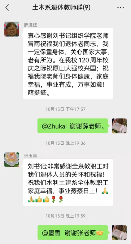 在淅淅沥沥的小雨之下,各位老师和学生登高望远合影留念并录制短视频向每一位退休教师“喊话”送上诚挚的慰问与祝福。土木工程系退休教师收到祝福后,反响积极,深受感动,对各位老师的祝福表示由衷的感谢。