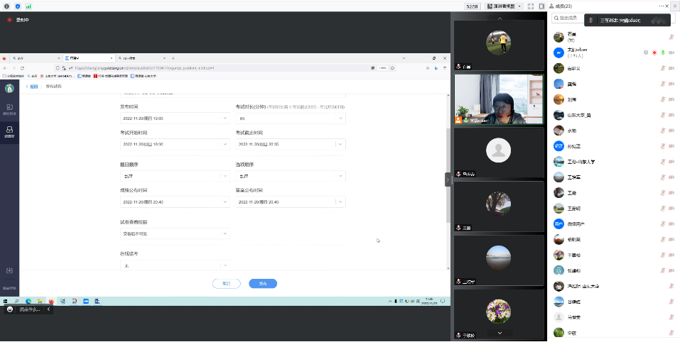 宋娟向与会老师介绍了“雨课堂+腾讯会议”的线上考试模式以及相关的操作方法和要求。宋老师详细讲述了线上考试需要学生做的考前准备,即准备身份证明、准备设备与网络、熟悉考试流程。她结合自己组织线上考试的实践经验,完整总结了线上考试的流程,就准备线上试卷,设置考试时间,学生如何作答,收卷、阅卷、发布成绩、分析试卷,线上监考要求等做了细致讲解。随后,宋老师通过共享屏幕现场演示了线上考试时任课老师和监考老师操作雨课堂和腾讯会议等软件的步骤和方法。
