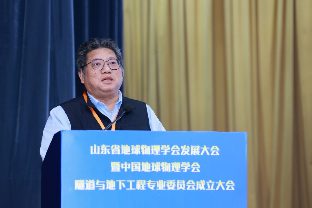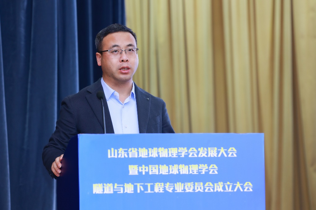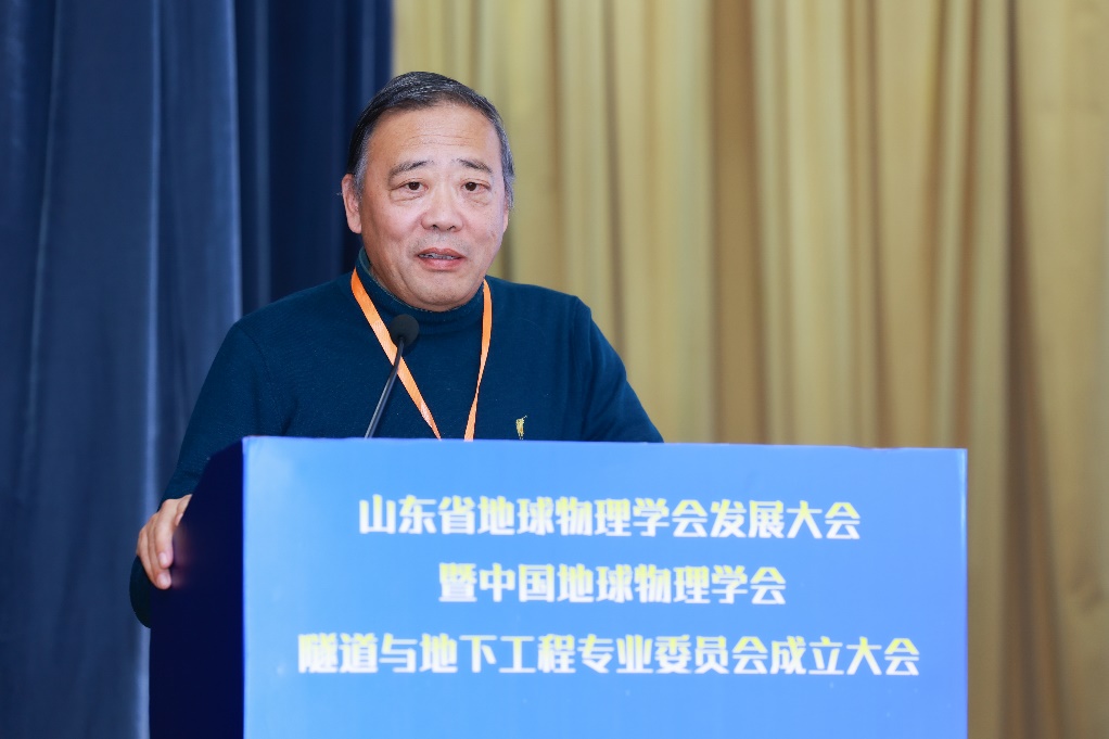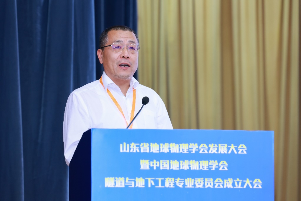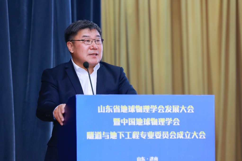 中国地球物理学会副理事长兼秘书长郭建致辞,向大会的召开表示热烈的祝贺,介绍了中国地球物理学会的发展历程,肯定了山东省地球物理学会成立20年来取得的优异成绩。他表示,成立隧道与地下工程专业委员会是一项创新举措,呼吁专委会强化思想引领、加强学科交叉、深化校企联合,推动地球物理科技在隧道与地下工程领域的前沿技术创新。