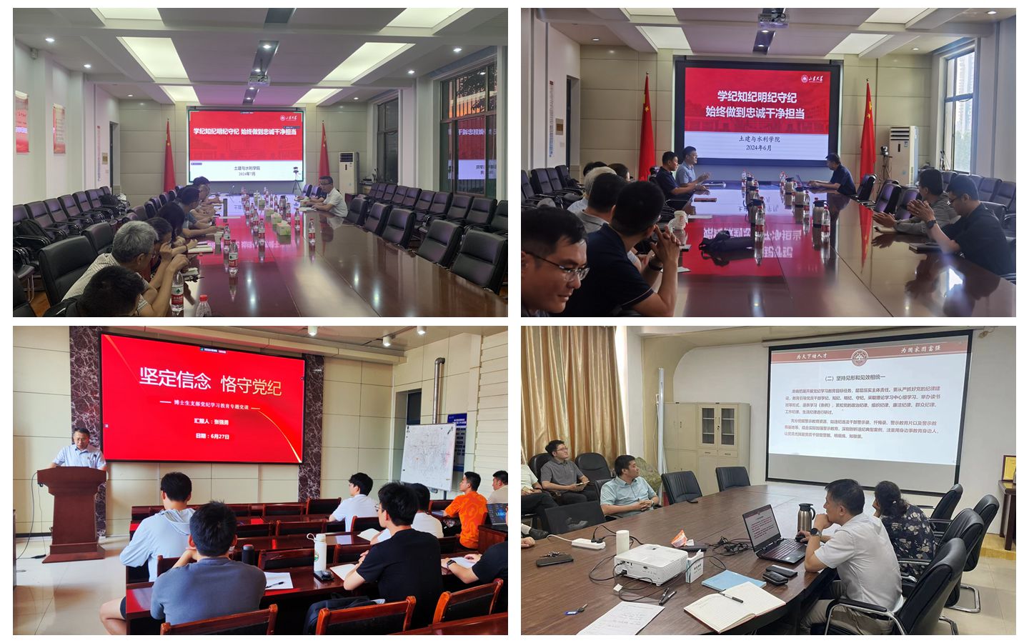 为扎实推进党纪学习教育走深走实,6月19日-7月23日,土建学院领导班子走在前、作表率,以“学纪知纪明纪守纪 始终做到忠诚干净担当”为主题,分别为各师生支部讲授党纪学习教育专题党课。