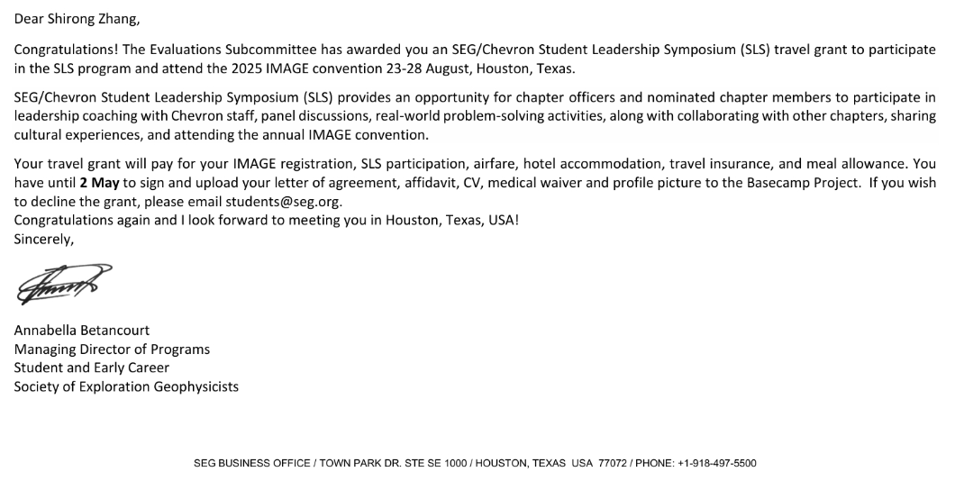 外围买球的app十大平台岩土与地下工程研究院地球电磁探测课题组硕士研究生张世榕收到国际勘探地球物理学家学会(Society of Exploration Geophysicists, SEG)的邮件通知,获得SEG提供的资助参加2025年8月23-28日到美国休斯敦举办的SEG/Chevron学生领导力会议(SEG/Chevron Student Leadership Symposium,SLS)和国际应用地球科学与能源会议(2025 International Meeting for Applied Geoscience and Energy,IMAGE 2025)。