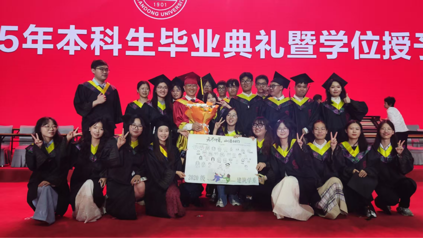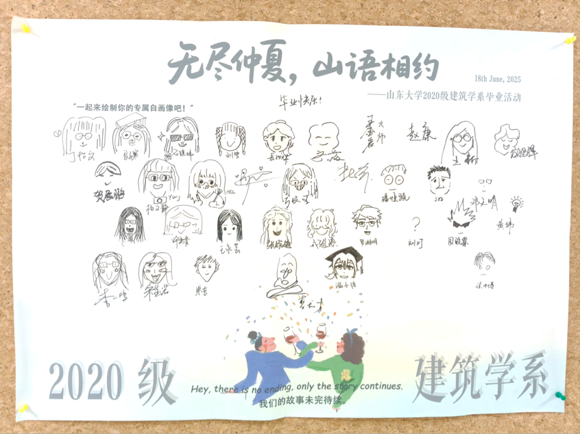 无尽仲夏里,我怀念建筑学永远的群像,和同学之间的未完待续变成夏日限定。山语实验平台上,2020级建筑学的毕业派对在暮色中展开,我们围坐畅谈,将心事与憧憬倾注于这最后的校园夜晚。作为外围买球的app十大平台建筑学专业通过评估的首届毕业生,也是校史上第一批建筑学学士,我们在毕业典礼上与李术才校长共同见证了这一历史性的时刻。最动人的时刻,是同学们邀请校长一起完成那幅充满童趣的卡通画像,校长认真的侧脸,与周围年轻的笑容相映成趣。在快门声和欢笑声中,我们既庆祝山大建筑学的崭新未来,也迎接人生这一特殊节点——本科生活在此刻温柔落幕,而新的征程正悄然启航。
