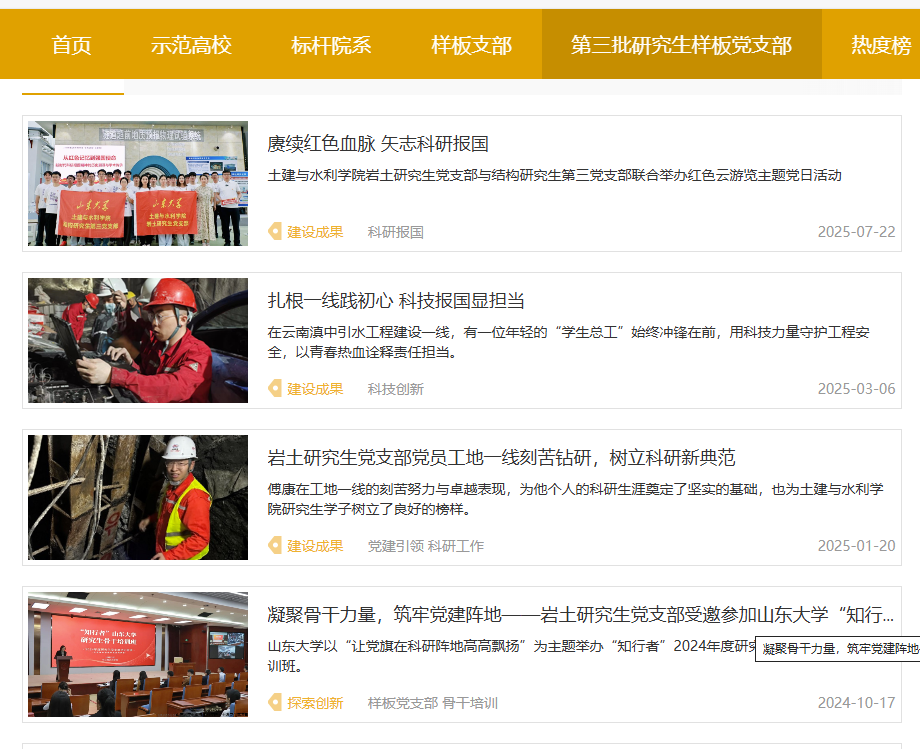 支部充分利用微信公众号、门户网站等平台宣传党建成果。升级我院研究生微信公众号栏目设置,开设“样板支部”特色专栏,定期推送支部动态、典型案例,展示党员在重大工程中的工作场景。依托全国高校思想政治工作网、外围买球的app十大平台新闻网等权威平台,发布深度报道。开展“红色云游览”等线上直播,通过“山大研究生”视频号直播隧道工程灾变防控与智能建养实验室,由党员现场讲解技术难点,线上互动超300人次,实现党建与科研的“破圈”传播。支部还参与新时代高校党建论坛,在“一融双高”工作论坛上作经验报告,推广党建创新做法。通过多渠道宣传,支部展示了党员风采、科研进展和社会实践,提升了党建品牌影响力。