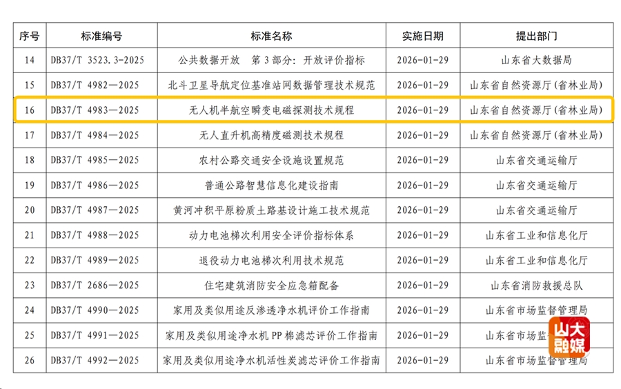 近日,山东省市场监督管理局批准发布了《无人机半航空瞬变电磁探测技术规程》(DB37/T 4983-2025),该地方标准将于2026年1月29日正式实施。