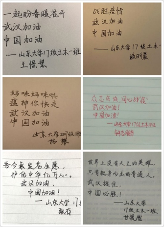 2017级土木一班团支部组织同学接力手写祝福,为大家鼓气;2018级同学在团支部组织的疫情调查问卷中表达自己对武汉及国家的祝福。