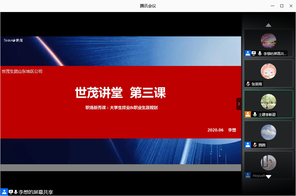 6月19日下午,外围买球的app十大平台联合世茂集团山东地区公司开展学涯职涯指导课之“世茂讲堂”第三期。世茂集团山东地区公司人力行政总监李想,校招负责人王梦丽,土建学院党委副书记张强,团委书记兼学工办主任梁莹,2019级辅导员何玥出席本次活动。讲堂由李想担任主讲,土建学院2018级辅导员李新迎主持。