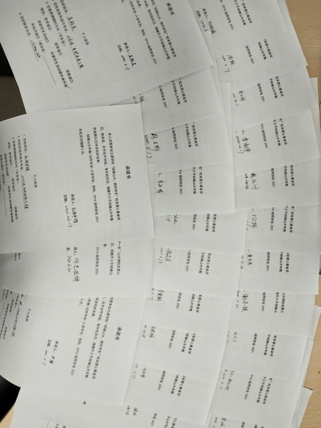 突出传承,薪火传递。本科毕业生将教材、辅导书、笔记等近1000本赠予学院,学院颁发捐赠证书并代为保管图书,开学后赠予低年级的同学们使用,将学习经验总结与深厚情谊传递给学弟学妹们。70名同学捐款347元,并承诺每年校庆日捐赠不少于结缘山大年数的资金支持学校学院发展,正式启动“结缘山大,相伴一生”毕业生校友爱心基金项目。