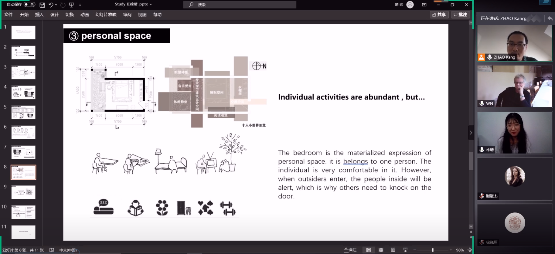 本国际课程包含1个研究主题下的3个子课题,学生需参与其中并独立完成研究。7月8日,参课学生以报告展示的形式首先汇报了第一部分课题“Experiencing Density - the Distance and Comfort”(感知密度-距离与舒适度)的研究成果,Nägeli教授同赵康老师进行的评讲与总结拓展了同学们的研究思路,加深了同学们对城市语境下人居密度相关概念的理解,使同学们受益良多。在接下来的两天时间,同学们在老师的指导下进一步将研究加深推进到建筑空间中的密度问题(Density in Architectural Space)。23位同学分别以家庭自宅为研究对象,对其公共空间与私人空间的组织及渗透关系进行了深入分析与思考。本项小课题基于前一项关于人对距离感受的研究成果并连接下一项关于城市尺度的居住密度研究,起到了承上启下的作用。Walter Nägeli教授和赵康老师在每位同学汇报后都给予了专业而详尽的评价和指导。