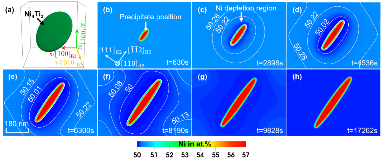 图1. Ni4Ti3沉淀相长大过程中成分非均匀场的演化。(a) 为Ni4Ti3 沉淀相的三维视图。 (b)-(h) 沉淀相周围Ni元素浓度场演化过程的二维截面图,该截面贯穿图(a)所示的Ni4Ti3沉淀相颗粒且平行于
