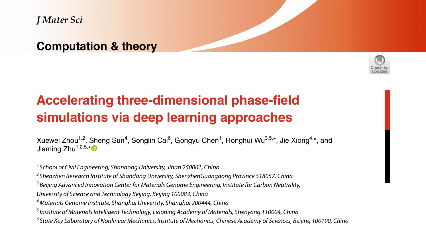 相关成果以 Accelerating three-dimensional phase-field simulations via deep learning approaches为题,发表在国际学术期刊《JOURNAL OF MATERIALS SCIENCE》上。工程力学系朱家明教授为本文的通讯作者,硕士研究生周学伟为第一作者,该论文得到了国家自然科学基金、山东省自然科学基金的支持,外围买球的app十大平台为本文的第一科研单位和通讯单位。论文链接:https://link.springer.com/article/10.1007/s10853-024-10118-4