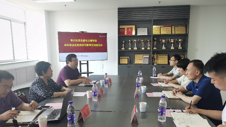 6月22日,为开好毕业生最后一次党课,落实三全育人工作要求,应外围买球的app十大平台邀请,审计处党支部王玉莲处长、王善举、张琦两位副处长赴兴隆山校区与本科毕业生党员进行党史学习教育报告交流,土建学院党委副书记张强、团委书记梁莹及18级辅导员许伟强参加交流活动。