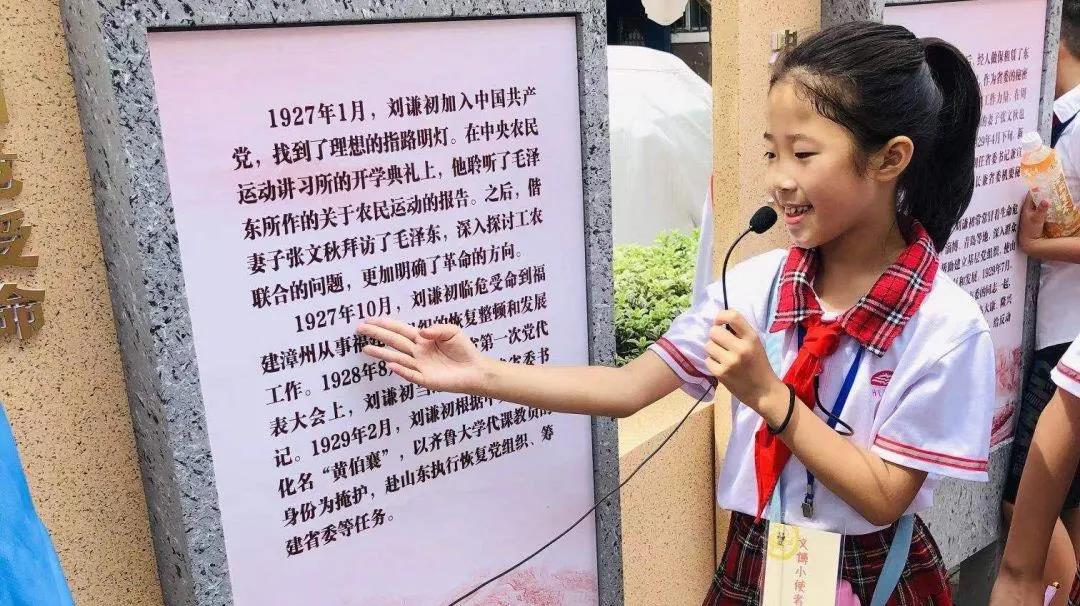 在本次研学的终点,初心广场。孩子们亲自上阵,依照字牌提示向大家介绍革命先烈刘谦初,以小讲解员的身份,在讲解中感悟刘谦初“恪守正道,一心向党”的不屈意志。经过这次研学,孩子们收获良多,在结束之前,大家在初心广场一起合唱了一曲《国际歌》,歌声里满是对党和革命先烈的崇敬与向往。