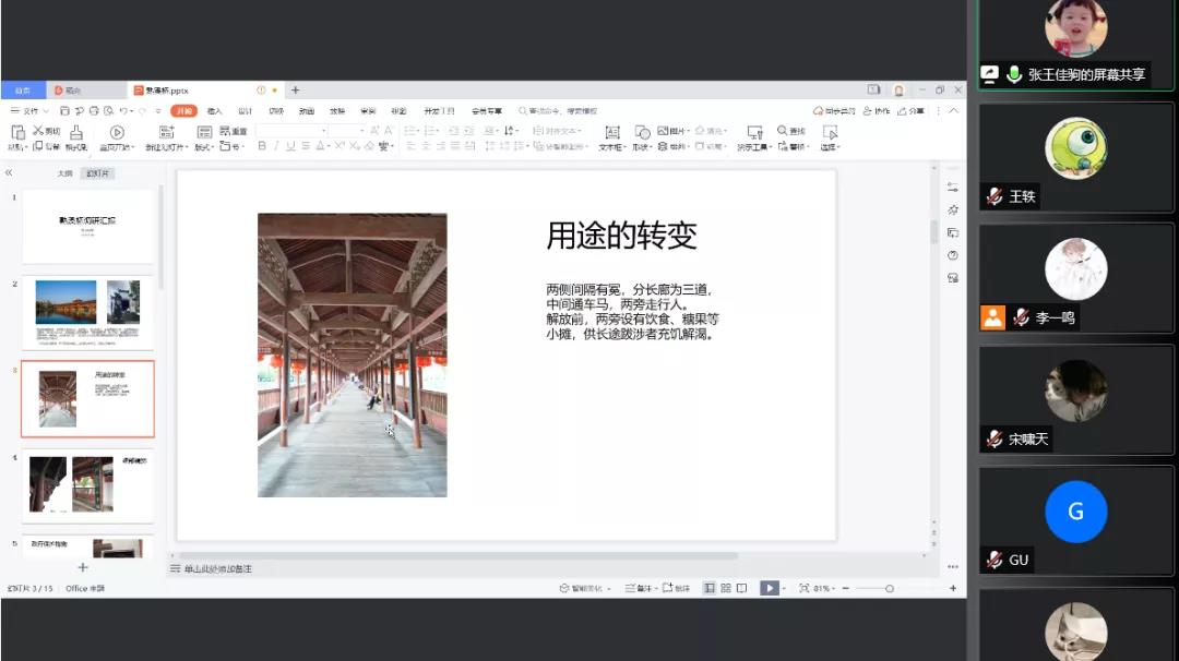 8月20日,下午15时,外围买球的app十大平台“寻筑”调研团于腾讯会议举行第四次线上分享会,对社会实践成果进行汇报。队长李一鸣主持会议,成员张王佳驹对浙江省金华市武义县熟溪桥调研的相关内容展开分析汇报,成员宋啸天、张钟华、王轶以及指导老师谷建辉参与本次分享会。