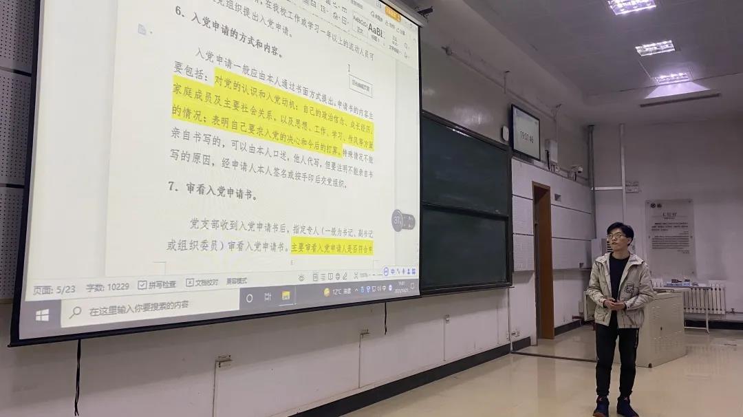 第二党支部组织委员孙帅明参照《外围买球的app十大平台发展党员工作规程(2019年5月)》,详细讲解了入党申请书的撰写、入党积极分子的确定和培养教育、发展对象的确定和考察、预备党员的接收、教育、考察和转正四部分的工作内容与时间节点,并重点强调了入党申请书的书写格式。
