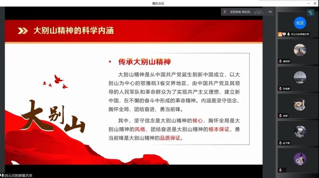 会上,赵子微、徐溢、龚俊榕、田云汉四位同志分别分享了家乡江西、四川、河北、安徽的红色故事,重点介绍了自己感悟到的老一辈党员身上的优秀品质,例如八子参军的勇于争先精神、智送鸡毛信的不怕牺牲精神、坚守信念的大别山精神等。最后,田云汉对会议进行了总结,他指出正是一代代共产党员在不同年代接续传承优秀精神,才使得党饱经风雨依然历久弥新,现在新时代,我们党员更需要学习传承老一辈党员时代精神,身体力行,将老党员的优秀精神发扬光大。