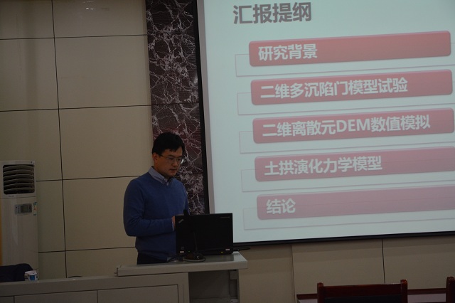 在报告中,芮瑞教授首先简要解释了成拱现象、土工效应及桩承式路堤等概念,接着介绍了二维多沉陷门模型试验。随后,芮瑞教授讲解了二维离散元DEM数值模拟,指出DEM模拟结果与模型试验结果相吻合,证明了试验和模拟的可靠性,在此基础上分析土拱演化的力学模型。最后,芮瑞教授向大家阐述了土拱演化的两层含义。