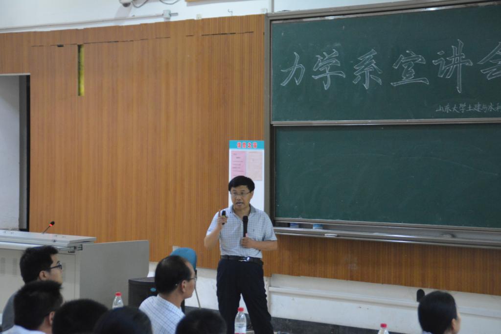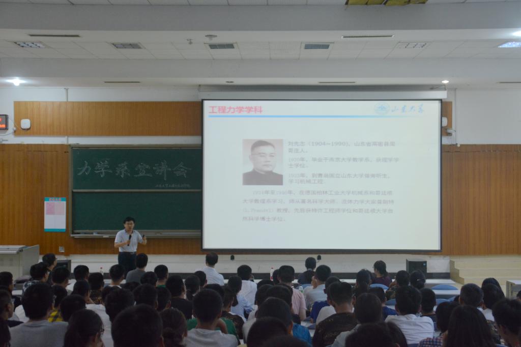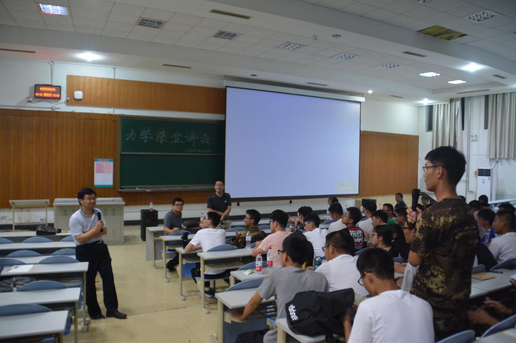 晚上7点,宣讲会正式开始。冯维明首先对近代力学简史做了介绍,冯维明指出,力学是众多应用学科尤其是工程学科的基础,是人类改造自然的工具。冯维明还向新生介绍了工程力学与航天、海洋、化工、农业、医学等工程的密切联系。之后,冯维明分别从土建学院力学系简介、学科发展状况、研究方向、科研成果、本科生教学、毕业方向等方面进行了详细说明。在介绍力学专业时,冯维明重点介绍了力学泰斗刘先志先生,并且现场播放了刘先志的事迹视频,令在场新生感受到刘先志的卓越贡献。在科研方面,冯维明介绍了工程力学系多个代表性成果,包括黄泛区粉土变形破坏理论研究、岩体水压致裂的成套装备研制和微纳米智能材料与结构的关键力学问题研究等,向在场新生科普了许多专业知识。最后,冯维明介绍了许多工程力学专业的优秀校友,从而详细地说明了工程力学专业学生的毕业去向。在之后的问答环节,在场老师针对新生提出的辅修数学专业、力学与航天工程的关系、毕业工作方向等问题做出了解答,其中,冯维明还向新生介绍了自己正在研究的登月项目,使新生对工程力学专业有了进一步的了解。宣讲会最后,崔新壮做出总结发言,发言中,崔新壮举了钱学森办学的例子,并结合自己参与土木工程项目的经历,强调了土建学院各个专业对力学的需求。崔新壮提到,中国是一个建设大国,建设型人才依旧是社会所需,作为土建学院学生一定要学好力学专业知识,为自己的学习与就职生涯打下坚实基础。