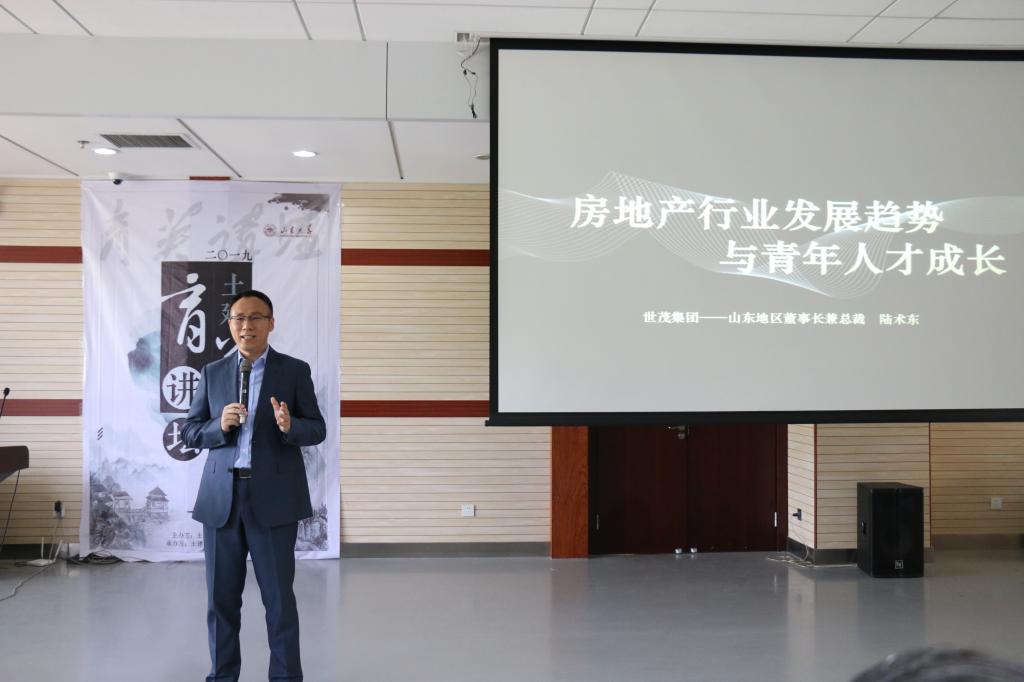 5月11日,外围买球的app十大平台于兴隆山校区图书馆报告厅举办了第一期育英讲坛。世茂集团山东地区公司董事长兼总裁陆术东应邀做题为“地产行业发展趋势与大学生发展规划”的讲座。世茂集团山东地区公司人力行政负责人、助理总监孙毅,组织人才发展招聘培训负责人、高级经理刘乐英,企业文化、校园招聘负责人王珺,董事长助理刘晓满,土建学院副院长张强勇,党委副书记张强出席本次活动。