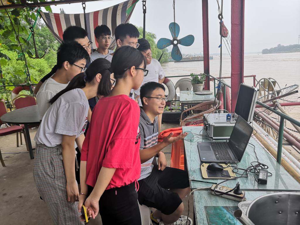 上 午8时30分,社会实践调研小队在李晶莹的带领下来到了基下500断面,参观走航式ADCP的实际操作。大家很快见到了正在岸边操作的展恩泽,他面前的电脑,正显示出黄河的实时数据。走航式ADCP利用了多普勒效应进行流速测量,具有能直接测出断面的流速剖面、具有不扰动流场、测验历时短、测速范围大等特点。通过走航式ADCP的应用,大大提高了水流速度,河流流量的测量精度,大大减少了测量时间,提高了测量人员的安全系数,具有很大的积极意义。9时左右,测量船从大艇上出发带着ADCP的全部设备,它通过无线信号与岸上的电脑连接传输实时数据,很快在电脑屏幕上出现了一条条色彩不一的或直或曲的线条。展恩泽耐心细致地给实践小组成员讲解不同线条的作用,各种问题都被一一解答。