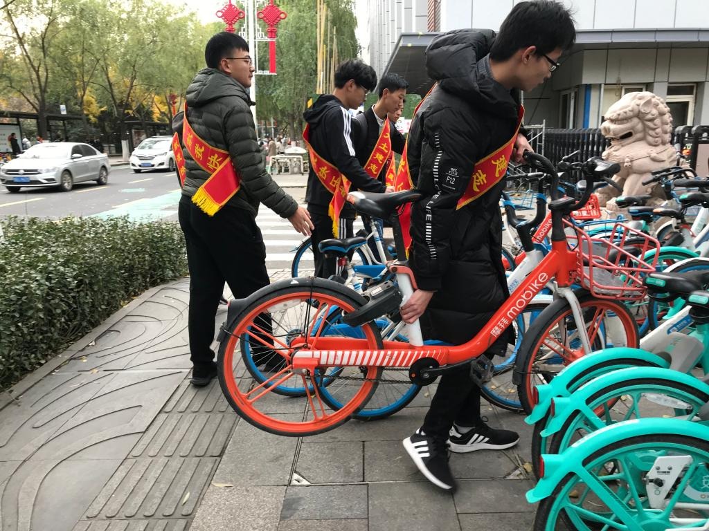 随后,志愿者们来到解放阁进行共享单车的整理工作。活动过程中,志愿者们积极认真工作,一起将不在正确位置的共享单车搬运到指定位置,对于损毁的自行车及时上报。期间,张秀华陪伴在志愿者们左右并给予经验指导。经过两个多小时的努力付出,志愿者们提前完成了此次志愿服务的工作。活动结束后,志愿者们与张秀华在解放阁前合影留念。