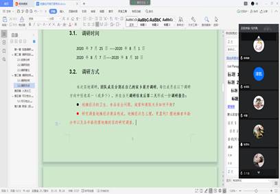 在第一次线上会议中,队长首先对人员进行了分工,明确了每个成员的任务与责任,同时组织队员对要调研的具体内容进行讨论,例如“疫情对地摊经济的影响”等,明确了队员实地调研的具体任务。此外,团队初步讨论了队员应以何种方式来进行实地调研。在会议最后,队员对于如何让地摊经济更好地发展各抒己见。在第二次线上会议中,团队最终确定了实践方案,并对一些实践细节进行了明确,例如活动地点、时间、方式以及如何记录调研成果等。这次会议确定了实践团队将紧紧围绕“如何摆好地摊”这一主题展开调研。团队成员将通过实地调研、线下采访、发放问卷、举办讲座、亲身体验等多种方式,在二十天内针对“地摊经济”的实际问题进行考察研究,与经营者、管理者、消费者进行广泛交流,发现问题,提出建议,解答疑惑。团队邀请土建学院团委书记兼学工办主任梁莹担任指导老师,辅导员何玥担任领队,由马天昊、王子涵、祁珊、计云献四位队员负责具体的实地调研任务,张君怡负责设计调查问卷,曲清越负责微影片的制作,李泽凯、公浩负责团队的宣传工作。团队成员将在各自家乡展开调研,服务防疫工作,助力复工复产。