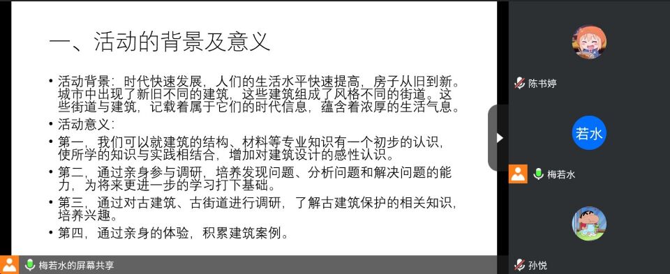 会议伊始,梅若水介绍了本次调研实践活动的背景与意义。建筑与街道,从古至今贯穿在我们的生活之中,普普通通却与人类的活动息息相关。它们记载着独特的时代信息,蕴含着浓厚的地域特色,各种材料的组合中,藏着无穷的值得探索的秘密。此次调研意在挖掘空间的美学,品读建筑与街道中深厚的文化内涵,在感受生活的同时培养学习兴趣、学习专业知识、提升解决实际问题的能力。