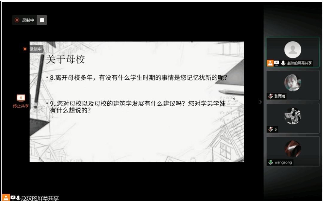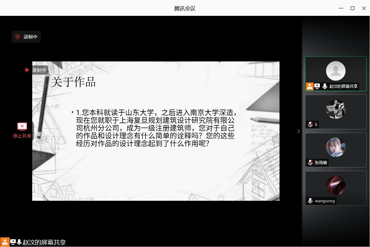 8月3日,外围买球的app十大平台“再话芸窗”社会实践团队通过腾讯会议对建筑学系校友王嵩进行个人专访。此次会议由赵汶主持,实践团队三名队员参加。