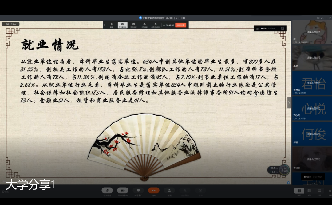 上午8时,同学们按时到达会议室并完成签到。首先,在志愿者张诗玥的主持下,进行了两个小时的大学专业分享环节。分享会邀请了来自中国人民大学、中国政法大学、吉林大学、武汉大学、北京师范大学、大连理工大学、中共中央办公厅电子科技学院、四川大学、电子科技大学的九位学长学姐作为嘉宾,在同学们介绍完所做的大学分享PPT后,他们为同学们针对与大学有关的问题进行答疑解惑。经过这个上午,同学们不仅对所分享的大学有了更深入的了解,更为自己今后的学习制造了动力。