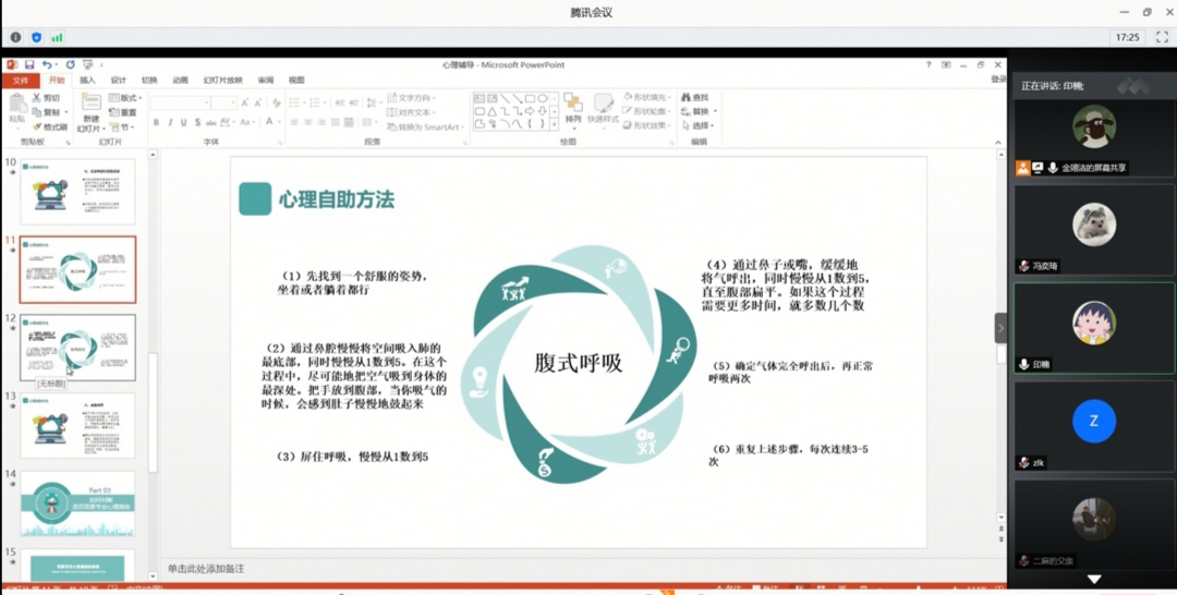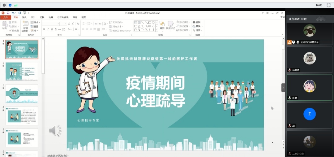本次讲座围绕“疫情期间心理疏导”展开,从“正确认识心境”“心理自助方法”“判断是否需要专业心理援助”“做好停课不停学”四个方面详细介绍了面对疫情时应如何把握情绪,积极向上地生活和学习。疫情期间,不仅要做好卫生防护,保障好身体安全,也记得关注心理安全,希望每个人都能做好心理自助防护工作,只有身心都健康安全,才能在防疫中取得胜利!我们应该接纳自己的不良情绪,做到不恐慌,减少因信息杂乱带来的心理负担,多进行自我对话和鼓励,慢慢重建生活学习秩序。讲座中,金翊洁还为大家详细介绍了几种心理自助方法。讲座结束后,团队成员进行简单总结,认为还应该加大宣传力度,帮助大家更好地认识自己的心理健康问题。