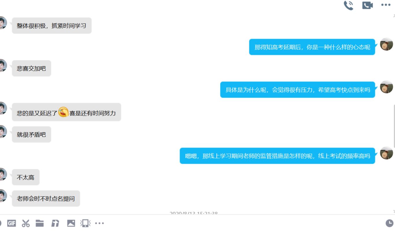 结合前一次采访,调研组后续讨论分析认为,线上学习并不适合普通的、自觉性不够高的同学。高考延期对于同学们的心理有影响,但影响并没有很大。同时,针对受访学生的经验分享得知,线上的按时预习,及时复习更为重要,同时要懂得利用线上授课可以回放的优点,及时查漏补缺。