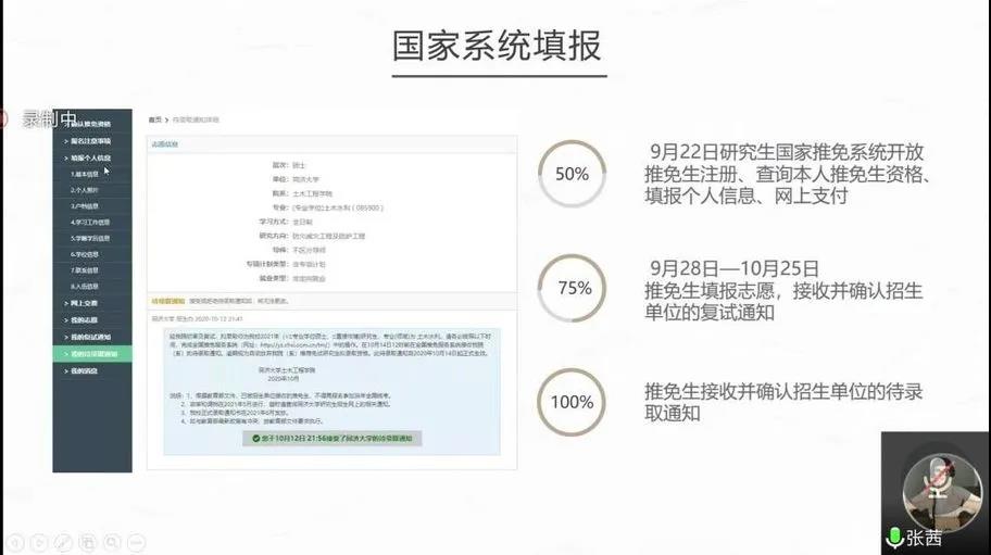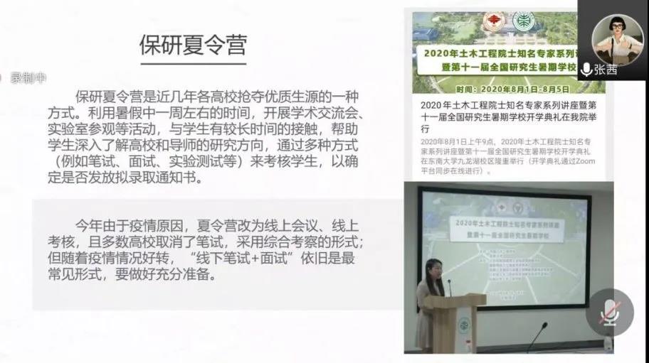 本次保研经验分享会由保研流程综述、详细介绍本校保研和各项单列保研、如何选择、如何准备四个方面展开。首先,郑星阳介绍了近几年土木工程系的保研率,建议同学们对自身条件进行评估,考虑自己保研成功的可能性。接着,他对“夏令营”、“预推免”和“九推”进行了简单介绍。张茜表示,学分绩点和比赛活动是取得保研资格的主要方式,同时强调了四六级的重要性。她向同学介绍了保研夏令营的参加流程,建议有意向的同学做好参加线下笔试和面试的充分准备。王晓阳从成绩排名推优和单列计划推优两方面进行讲解。他说明了土建学院2020届毕业生推免计划分配情况,并详细讲解了创新类单列计划分配办法、学习成绩优秀单列计划申请办法、百分制优异成绩单列计划申请办法和全面发展激励计划申请办法,说明了保资保研和支教保研的选拔推荐条件。黄斌建议同学们从所在城市、学科评估、行业认可度等方面对保研院校进行选择,同时说明了了解导师和联系导师的方式方法。王憬慧和甘锐雪结合个人经历,从材料准备、面试准备和现阶段准备三个方面向同学们提出了宝贵建议。至此,本次保研经验分享会圆满结束。
