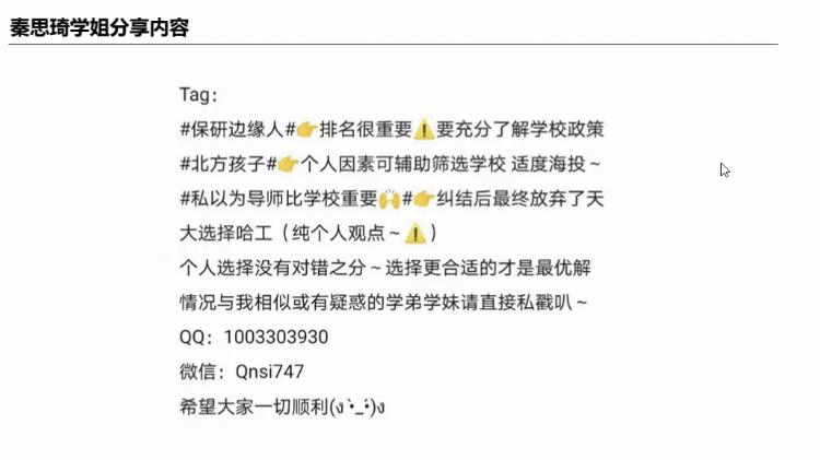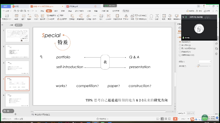 本次保研经验分享会由介绍保研流程、明确自身特质、如何准备保研、解答疑惑四部分组成。首先,陈珂臻从保研的各个时间节点谈起,建议同学们保持自律并进行阶段性的修正计划。她谈到要对不同的大学进行合理的取舍,并找到自己的特质,明确未来的研究方向。姜寒向同学们介绍了天津大学夏令营的基本情况,并强调了竞赛、论文和英语成绩的重要性,她指出同学们要尽早找到合适导师。秦思琦建议同学们要注重自身在学校的排名并了解学校政策,选择适合自己的才是最优解。至此,本次保研经验分享会圆满结束。