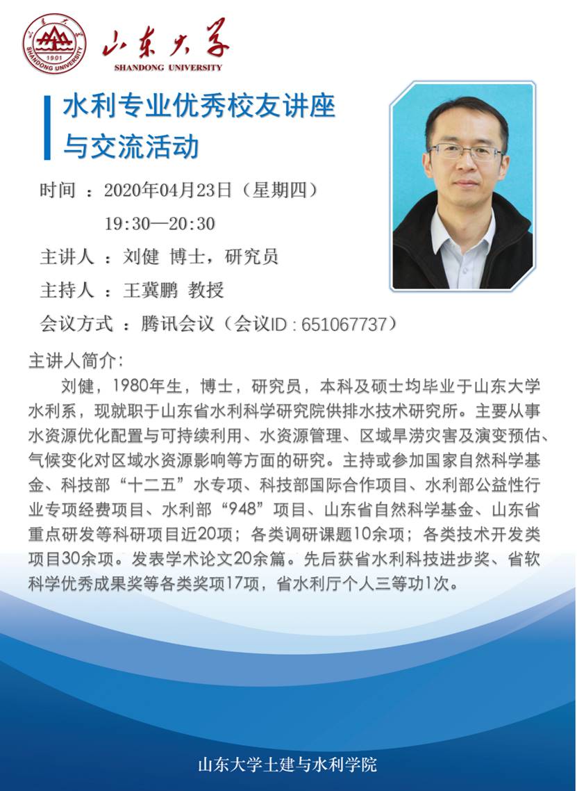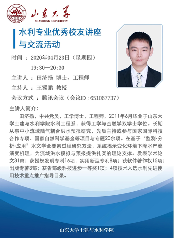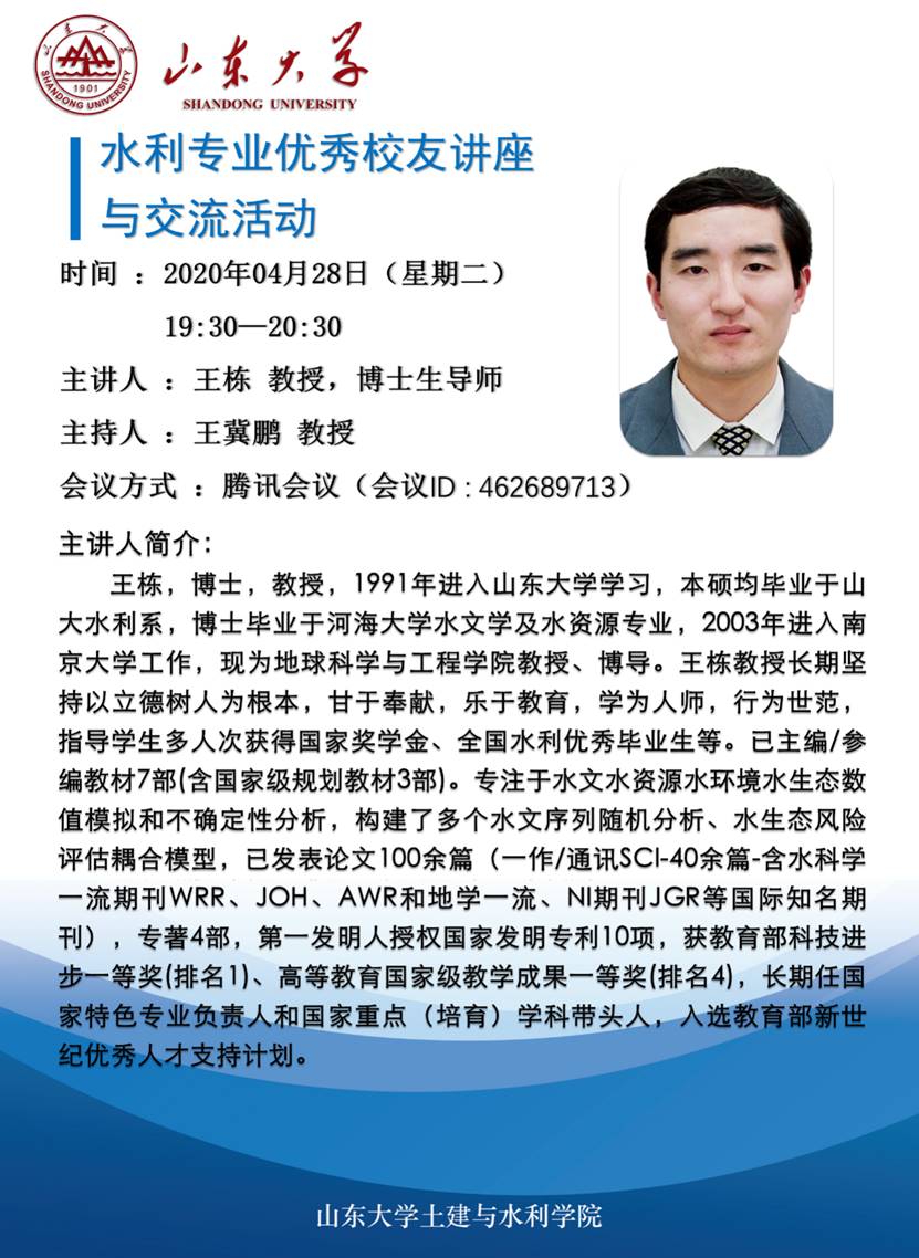 4月23日与4月28日晚,外围买球的app十大平台水利系举行水利专业优秀校友线上讲座与交流系列活动。水利系优秀毕业生代表,南京大学教授王栋博士、山东省水科院研究员刘健博士、中国水科院工程师田济扬博士受邀进行了线上讲座与经验交流,会议由王冀鹏教授主持,水利系党支部书记苗兴皓出席会议,水利专业全体一年级本科生和部分其他年级同学参加了此次会议。