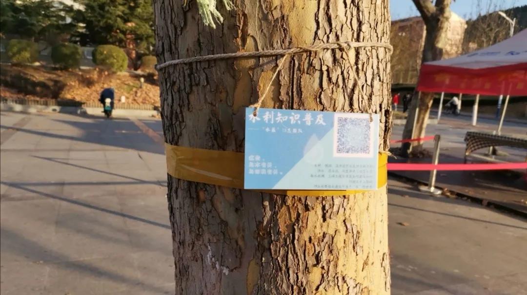 清扫落叶工作结束之后,同学们开始在校区各个地方的树上悬挂自制的树牌。树牌以“水利知识普及”为主题,有两种不同样式,上面附有二维码,来往同学可以通过扫码看到由2019级水利系同学整理编辑的三个类别共九篇有关水利知识的文章。树牌分布在白玉兰路、校车站点、实验楼、快递中心、欣园餐厅西广场等多地,为同学们提供长期的知识普及。