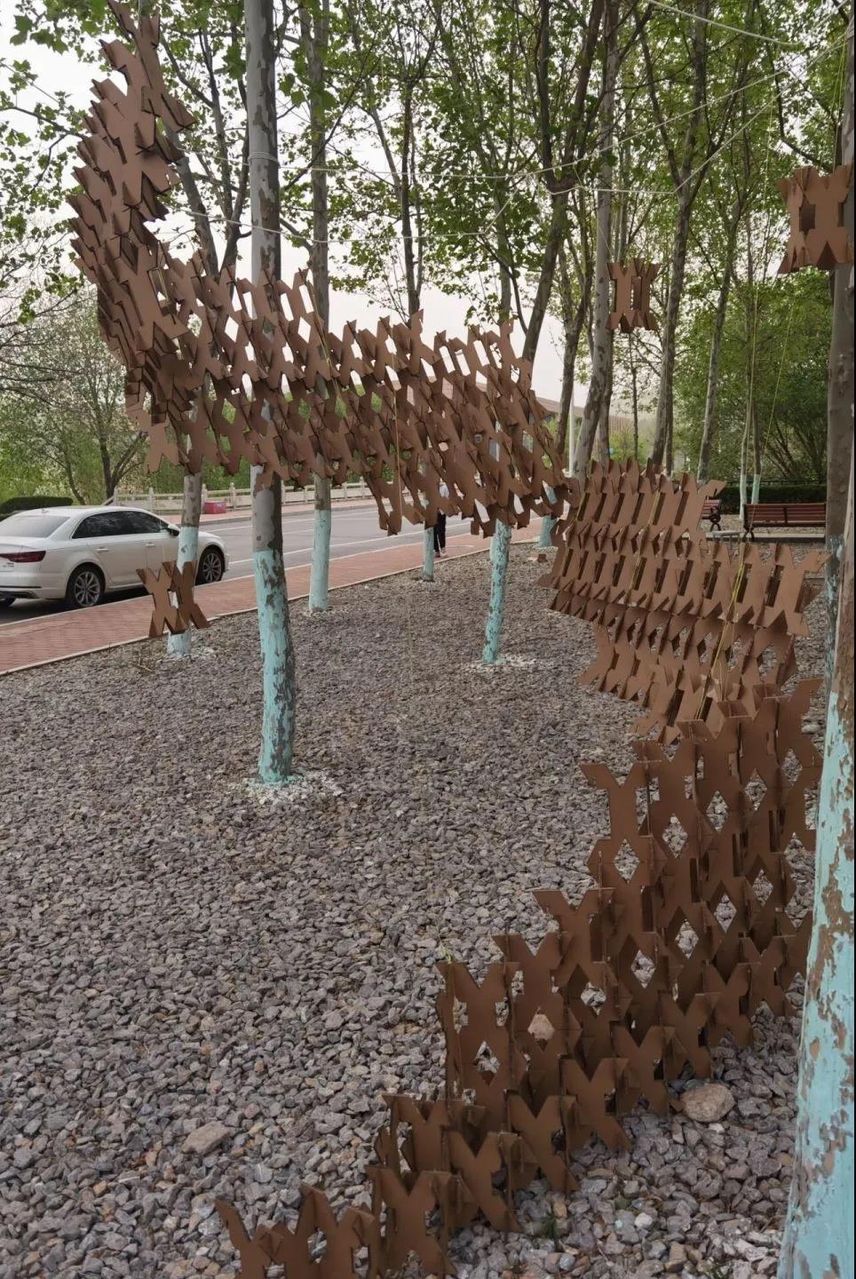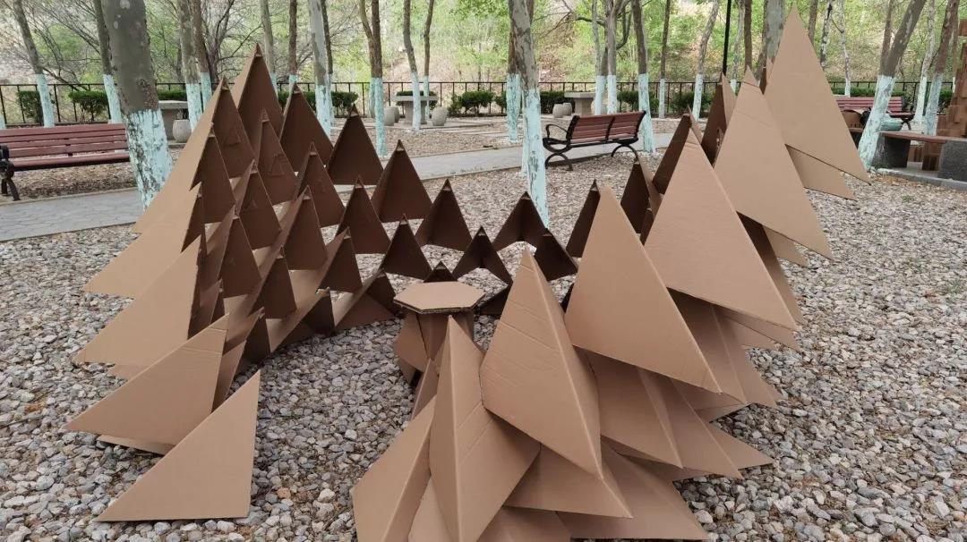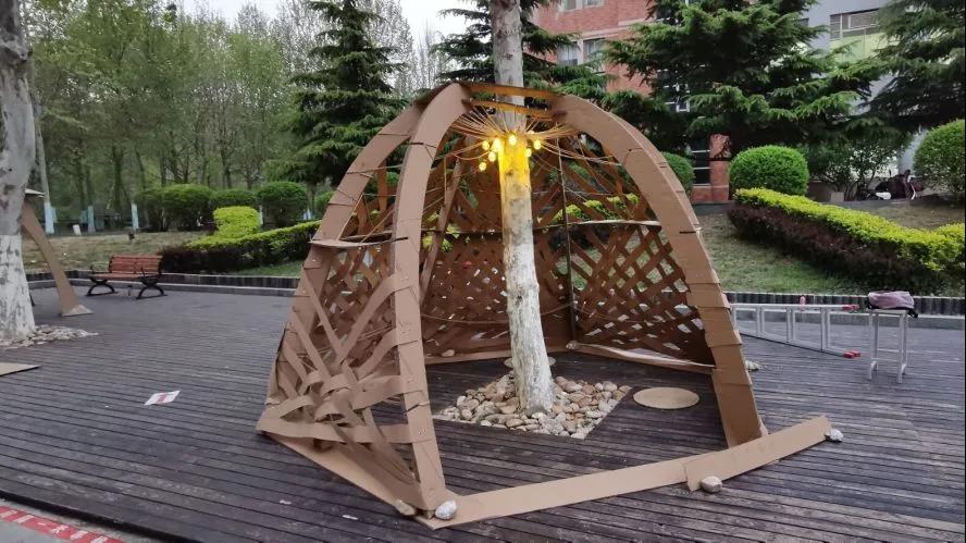 各组有各自的创意,处理瓦楞纸的方式多种多样——编织、单元穿插、折纸、悬挂……简单的瓦楞纸被玩出了花样,有的组把树包藏在建造物之中,宛若自然生长;有的组把建造物挂在树上,变妖风为亮点;有的组穿绳系树,牵引风车,风吹过,风车转,为静态的建造物添一分灵动。尽管各组各有不同,但对搭建作品的喜爱却如一。有人架好机位,用延迟摄影捕捉下一帧帧的美好;有人买来灯泡,像为家装修一样装点着作品,营造温暖而舒适的环境。