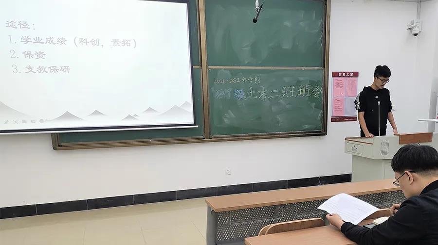 会议伊始,2018级优秀学生代表潘容与和张千向同学们交流了保研经验,分享了学习心得。首先,张千对保研的相关事宜进行了介绍。同时,他就课程方面对大三的特点做出分析——学分高,限选课开启,专业课程难度加大。最后,他向同学们分享了学习技巧以及经验,鼓励同学们树立目标,勇于拼搏。随后,潘容与从夏令营、预推免、科创等方面,对保研的准备流程做出介绍。他结合自身实际经历,详细地讲解了同济大学等高校的夏令营活动。他还强调同学们要注重英语学科的学习,并建议同学们多关注各高校研究生招生信息网的信息。