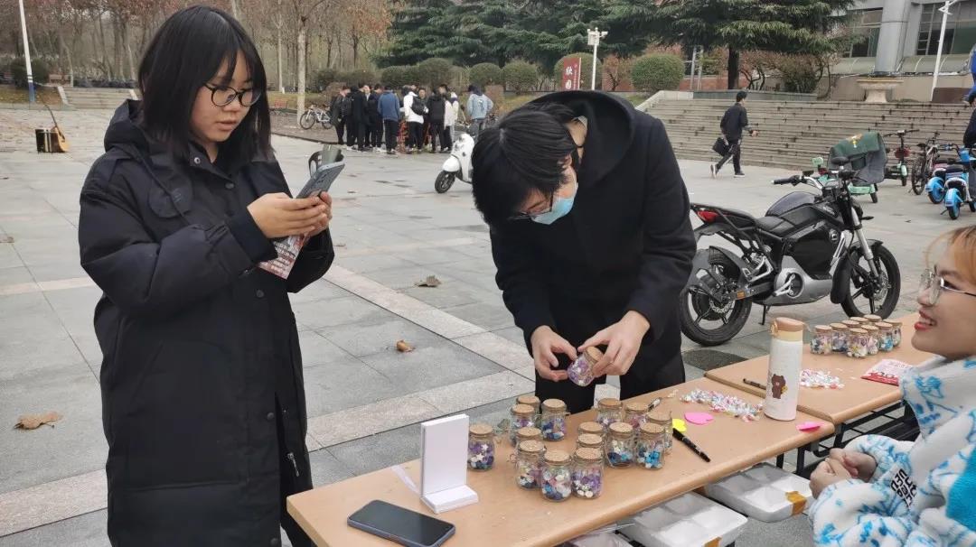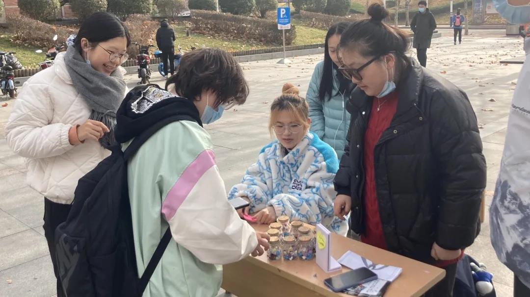 外围买球的app十大平台2020级建筑二班于11月21日中午在欣园西门举办义卖活动。本次义卖活动的卖品主要是许愿瓶,其中装满了同学们亲手折叠的纸星星和买来的糖果。同学们别出心裁,将对他人的美好祝愿写进纸星星中,将此心意传递社会,传递远方。