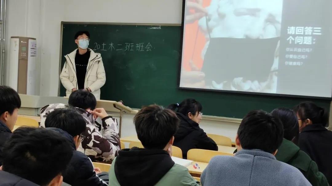 为帮助同学们缓解学习压力、更好地调整考试前学习状态,近日,2020级土木二班于教学楼1203教室开展心理活动。李昌昊同学主持,班主任刘梅出席,土木二班全体同学参与。李昌昊督促大家学会接纳自己、欣赏自己,要时刻保持良好心理状态。本次会议有助于同学们更清楚地了解自己,调整好学习状态,更加从容地面对学习和生活上遇到的困难。