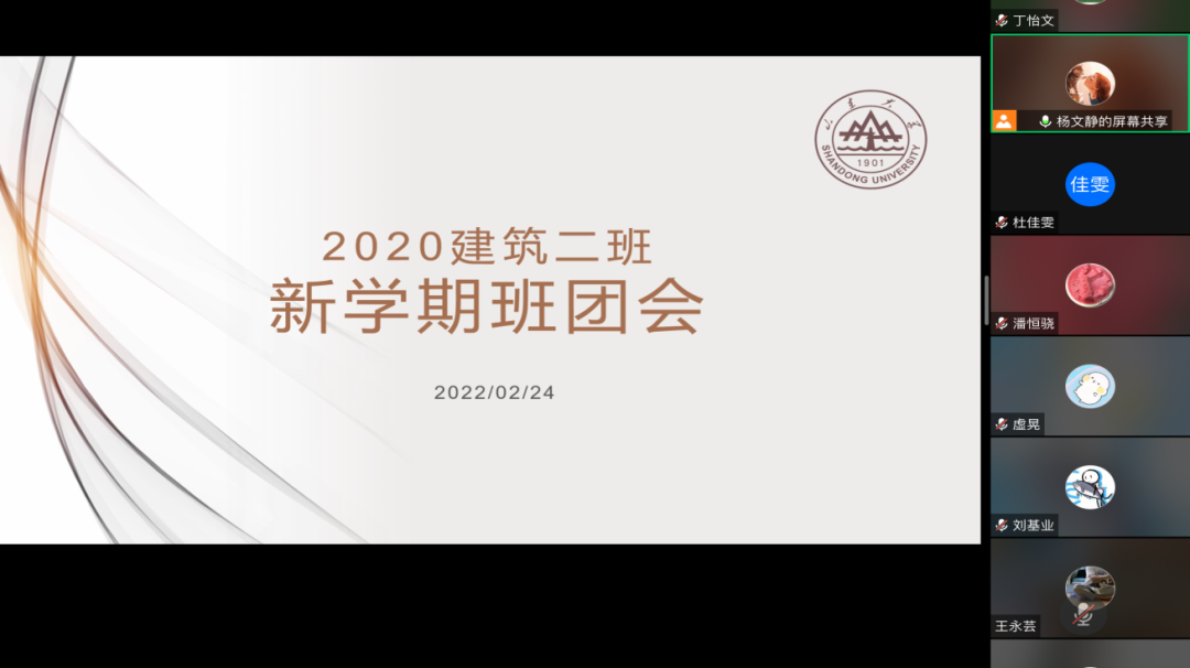 2月24日下午,2020级建筑二班线上召开新学期班团会,班长杨文静、团支书刘雪主持。杨文静带领大家总结了上学期班级工作并强调继续严格遵守疫情防控的相关规定;刘雪带领同学们讨论了本学期主题团日活动等。