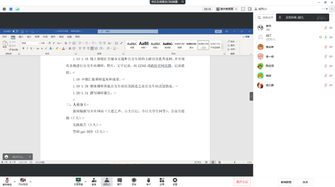 会议伊始,刘汀带领大家重温了社会实践安全事项与报道宣传工作,而后就本次实践出现的问题做了针对性调整并进行了后续工作说明展示,他详细介绍了工作流程,并就重点工作进行了强调,包括调研公交车站要仔细观察分析并亲身体验,发现该公交车站是否有不方便候车人群使用的设计、公交车站是否对周边产生阻碍、公交站点位置的设置是否对于城市交通运行有影响、公交站点是否有建设质量问题等。