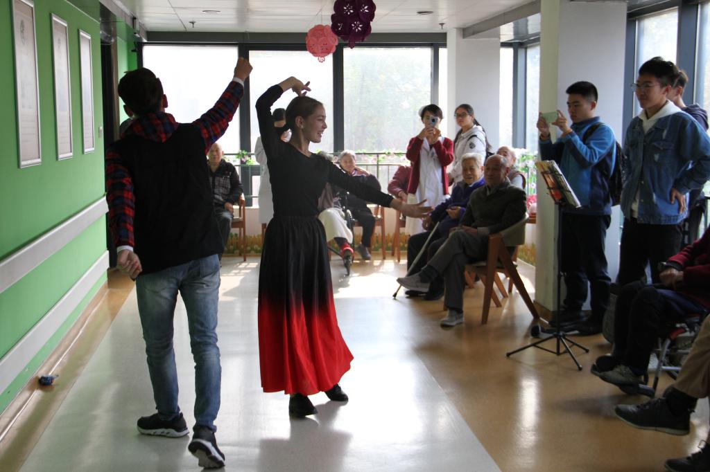 随后,同学们按照分工开展相应的志愿活动,为每个房间的老人送出新鲜水果和亲手制作的纸花球、小天鹅,并与老人聊天、了解他们的生活,与老人一起唱红歌……一个个暖心的活动,既传达了同学们的志愿热情,又传递了同学们对老人的关心与祝福。随后,大家现场表演了精心排练的节目,吉他、新疆舞、合唱等节目都获得了阵阵掌声。在场的老人观看同学们的表演,与同学们聊天,度过了一段美好的时光。