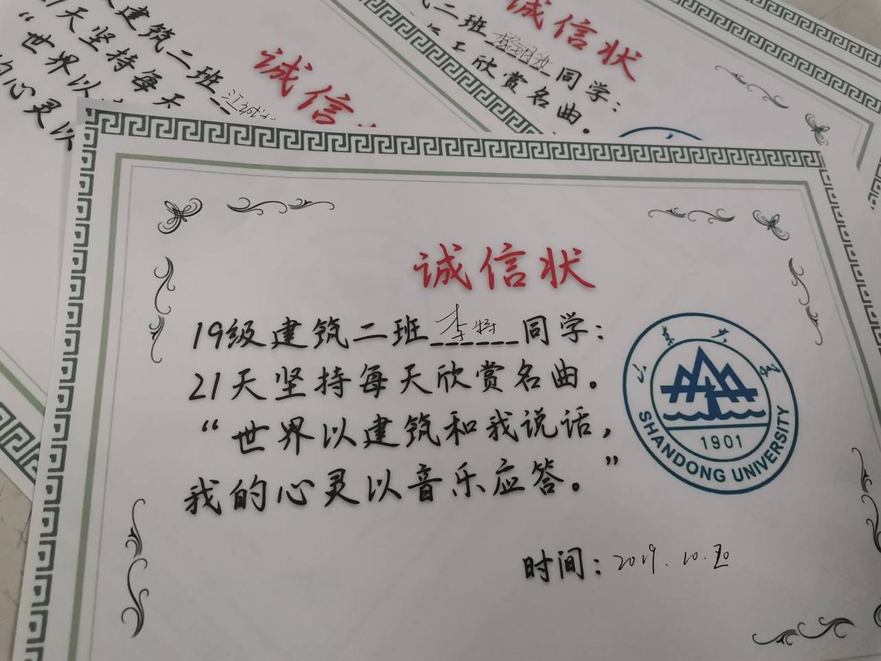 为强化艺术修养、提高美学素质和专业能力,外围买球的app十大平台2019级建筑二班全班19名同学共同签署了“每天欣赏一首名曲”21天诚信状。