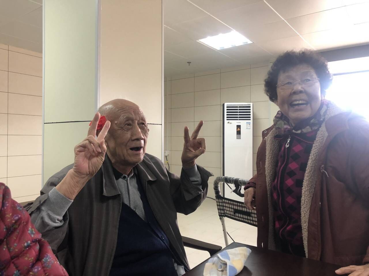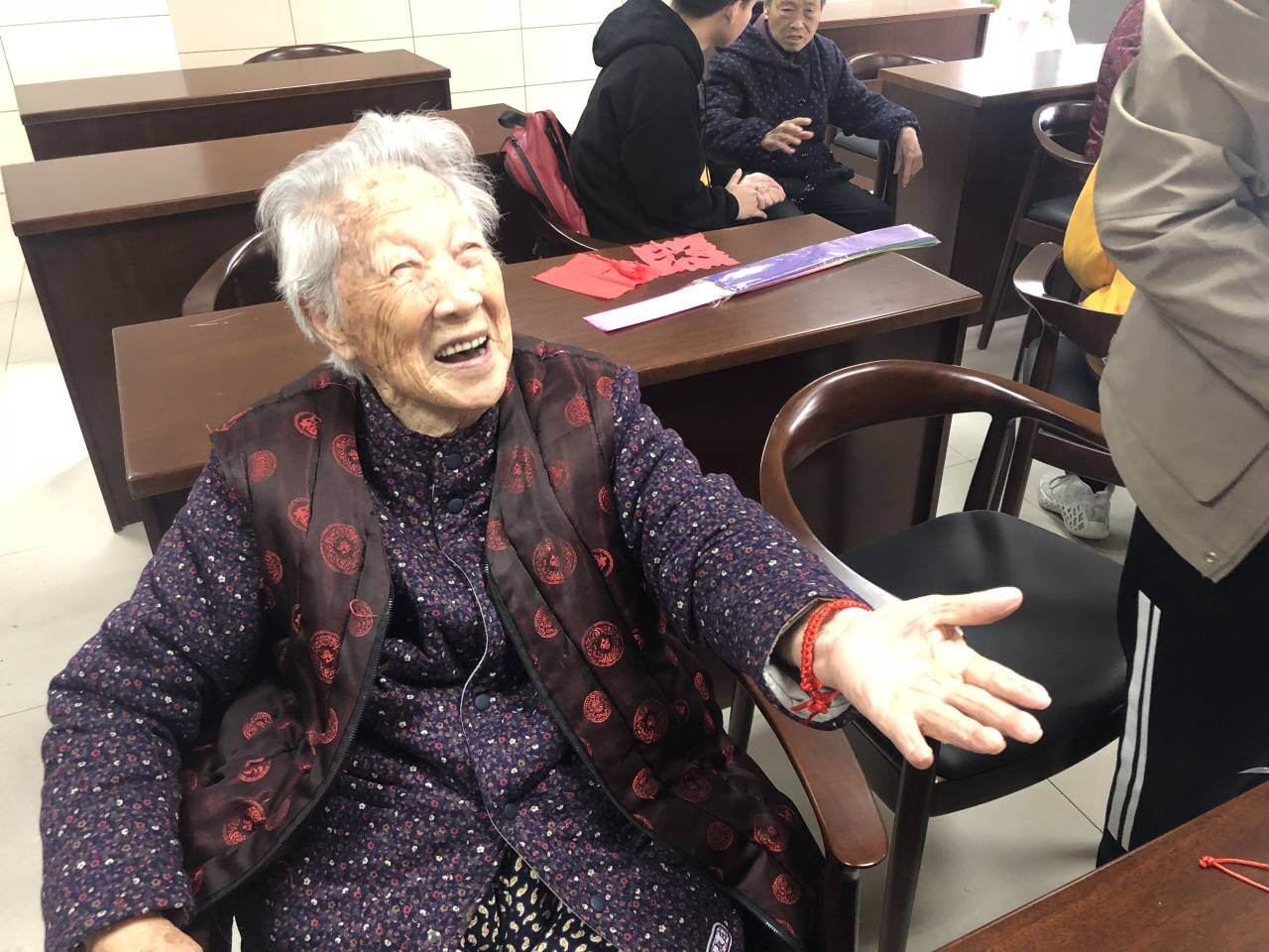 早上8点,全体成员在欣园西门集合,乘车前往济南善德养老院。到达养老院之后,工作人员首先带领大家了解了养老院的养老区和医疗区,随后按照计划带领小组成员到达二楼活动室进行准备活动。各活动小组分别准备了陪老人下棋、编中国结、剪纸、拼图等活动,希望能在跟老人们互动的过程中为他们带去欢乐与温暖。上午9点,老人们到达活动室,大家都积极参与到手工制作中来,活动室内气氛活跃,笑声不断。在陪一位九十三岁高龄的奶奶翻花绳时,同学们了解到,这位老人是解放后第一批参加高考的大学生,而如今她依旧精神矍铄,思维敏捷。还有一位已经一百一十岁高寿的老人,在同学们的帮助下兴致盎然地完成了多个剪纸作品。同学们临走前,老人们表示十分期待大家的下次来访。