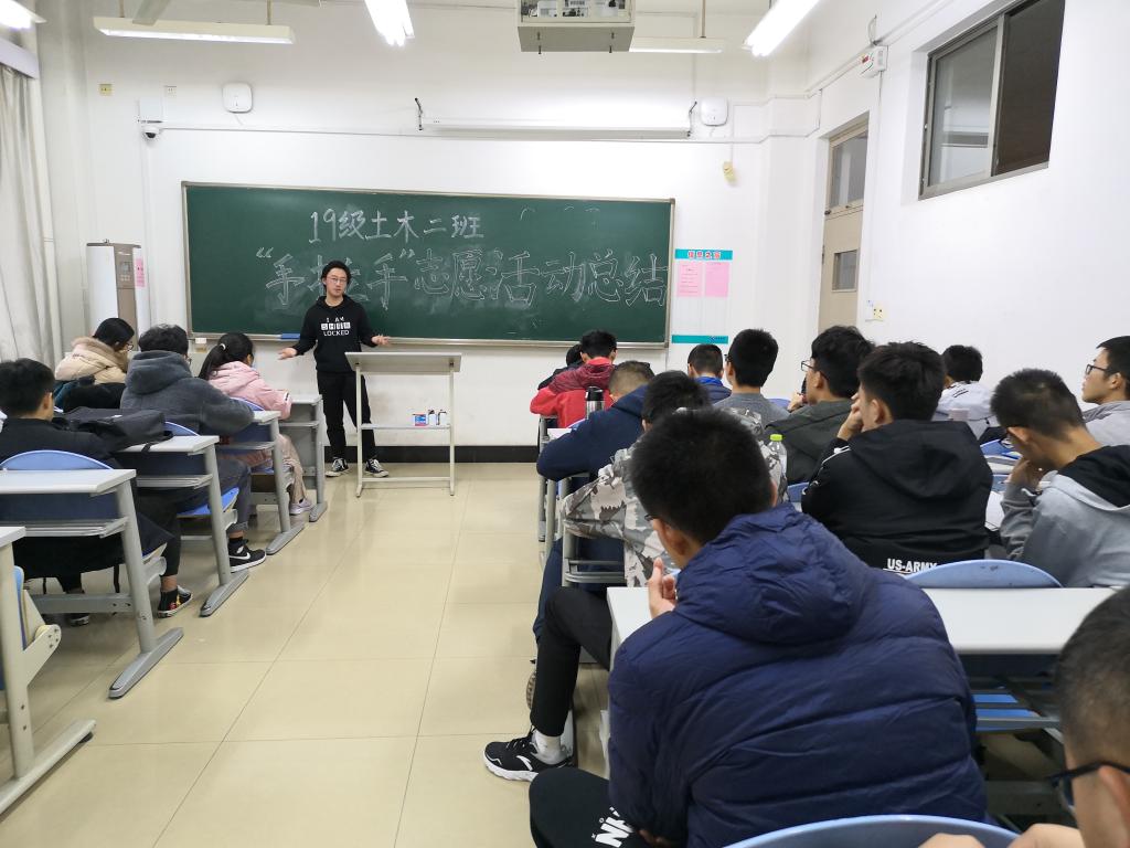 当日下午,在土木二班的手拉手活动总结班会中,班长马湛涛对此次活动中同学们的积极表现表示了充分的肯定。在随后的民主选举中,同学们选出了做出突出贡献的同学——王攀和刘彦臻,并授予他们“优秀志愿者”的称号。在发表感言时,王攀同学认为他只是做了自己应该做的事情。刘彦臻同学表示,感谢大家的认可,相比于他自己来说,班委们做的贡献更大,并且感谢班委的努力与奉献。两位优秀志愿者的讲话得到了同学们的支持与掌声。在班会尾声,同学们也就此次活动中出现的问题进行了深刻反思,并提出了相应的整改意见。最后,土木二班班委宣布,此次手拉手志愿活动圆满完成!