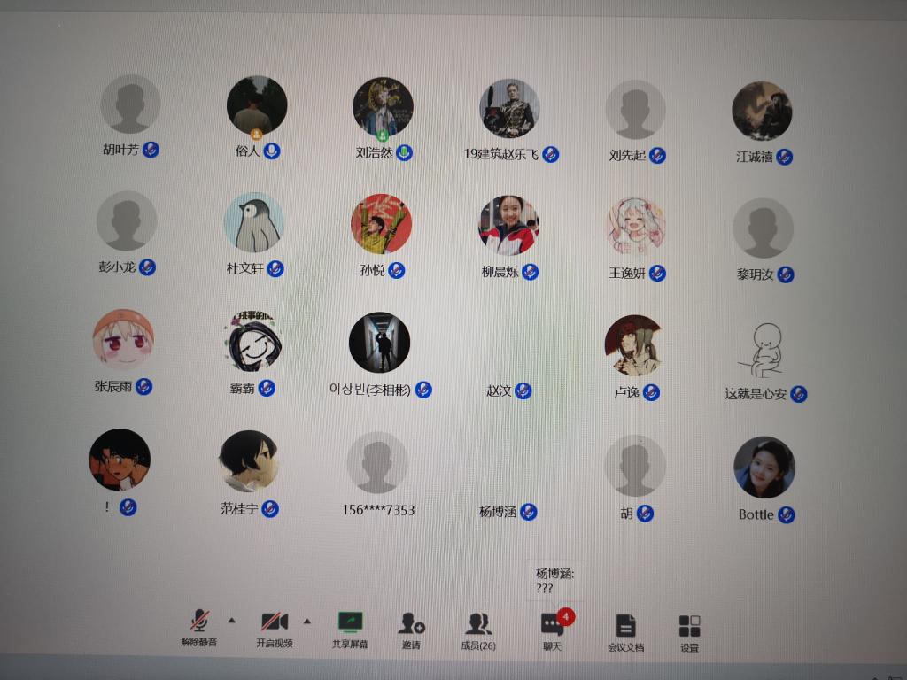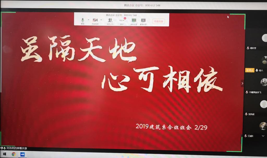 早上10点,会议正式开始。会议伊始,刘浩然播放了疫情期间健康生活的教育短片,提醒大家坚持锻炼身体,保持良好的作息习惯,认真对待学习。随后,刘浩然和李特针对疫情普及了一些健康生活习惯,着重提醒大家居家要保持通风,保持卫生,增强体质,勤加洗手。建筑二班心理委员胡舜凡给同学们普及了一些疫情可能会造成的不良心理影响,并就这一问题进行了深入探讨,引导大家正确认识此次疫情,他表示会随时关心同学们的心理动态,防止同学们因疫情产生心理上的负担。建筑一班学习委员徐巍珂就疫情期间的课程安排做了详细介绍,针对同学们可能会遇到的学习问题进行了罗列并提出解决问题的建议,同时督促同学们认真学习,积极完成各项学习任务。会议最后,同学们共同表示了“希望疫情早日结束,我们可以重回校园,共赏明媚春光”的美好心愿。
