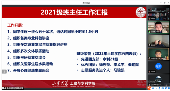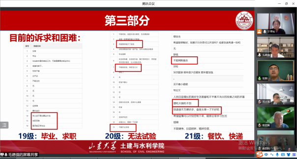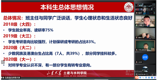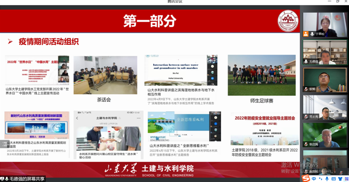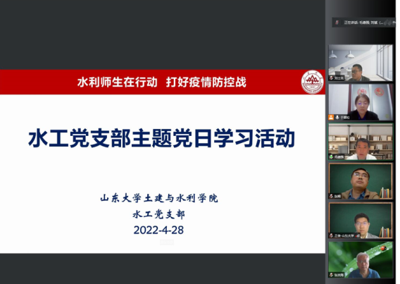 交流过程中,水工系毛德强、王冀鹏、张炯、于翠松还结合近期疫情防控分别汇报了校内教师工作生活情况、教学科研开展情况、本科生和研究生思想动态及学习生活情况、校外教师日常管理、支部共建以及“我为学生办实事”等相关工作。