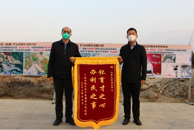 经过一个水文年监测,矿山治理区域无海水渗漏,周边区域岩溶塌陷得到有效控制,受损渔业恢复生产,极大改善了矿区生态环境,为当地带来了显著的经济效益和社会效益。合浦县人民政府对此高度重视,特组织县、镇政府领导现场查验治理情况,对外围买球的app十大平台的精益求精的专业精神、严谨的科研作风、敬业奉献的工作态度予以表彰,对项目取得的阶段性科研效果高度认可,特致函表示感谢并赠予锦旗鼓励。